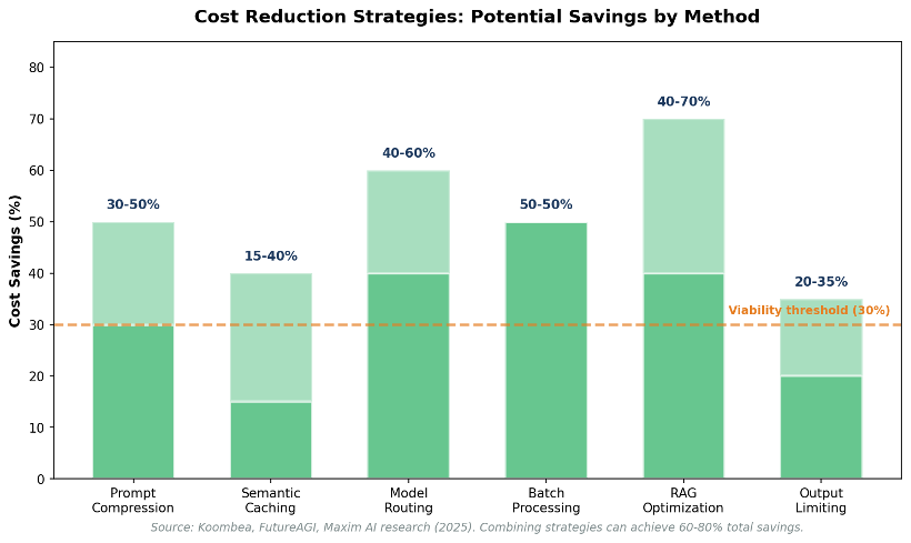 Research from FutureAGI, Maxim AI, and Ptolemay quantifies the savingspotential for each strategy: