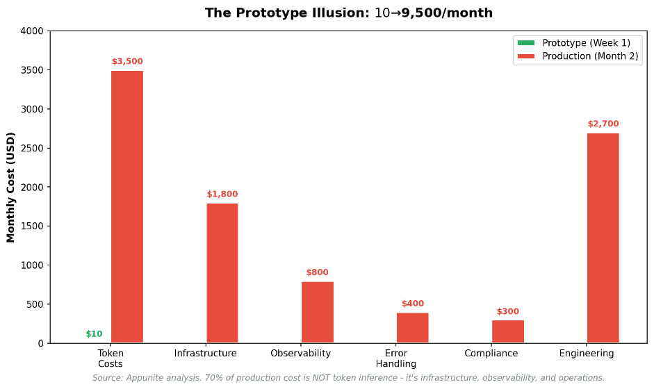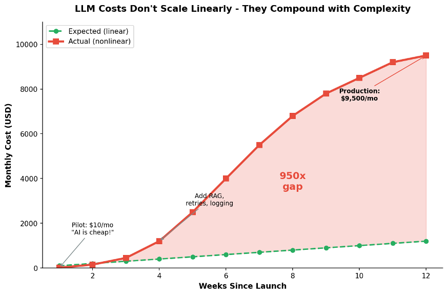 According to analysis by Appunite, the move from prototype to production can expose a 950× cost increase. A pilot that costs $10per month can grow to $9,500 per month within weeks as teams addRAG, observability, and error handling. Truly amazing.