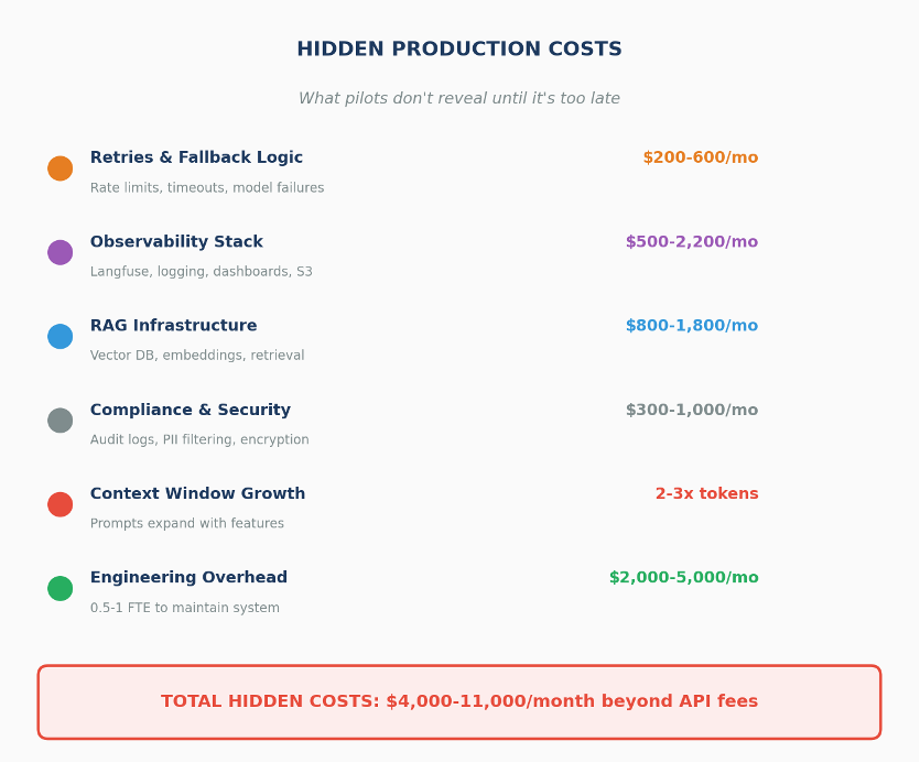 Token costs get all the attention, but vector databases, retrieval pipelines, monitoring, retries, and peak-load provisioning often double or triple the real cost per interaction. Teams that budget only for API calls discover this too late.