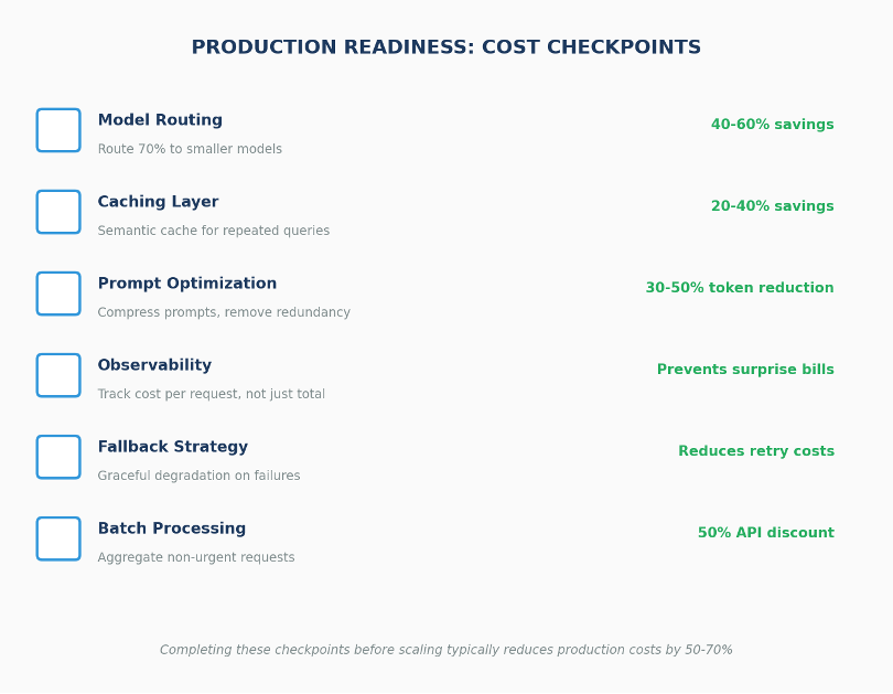 Before scaling, teams should put basic cost controls in place. According to Tribe AI, organizations that complete these checkpoints reduce production costs by 50–70%.